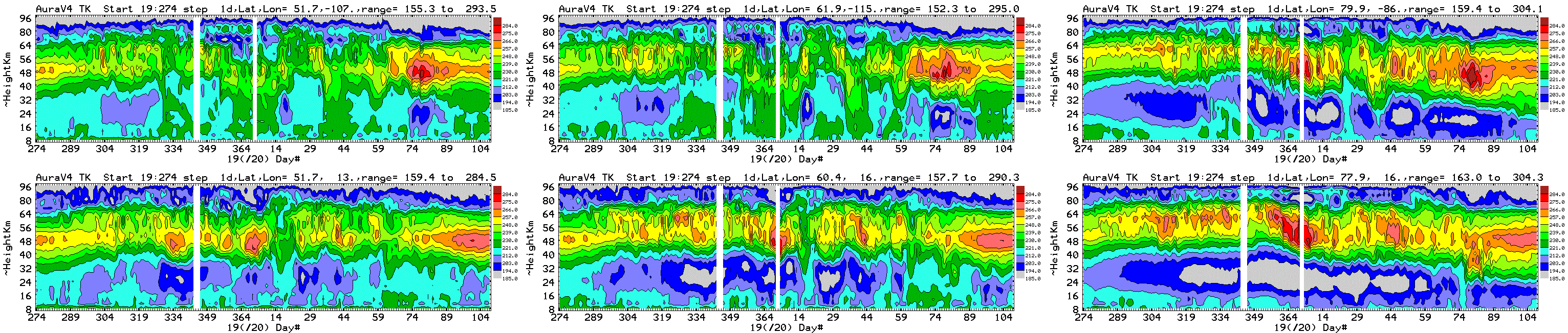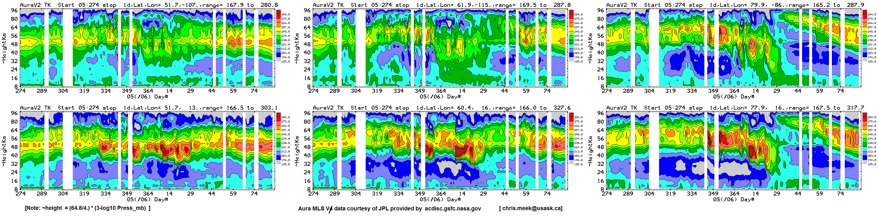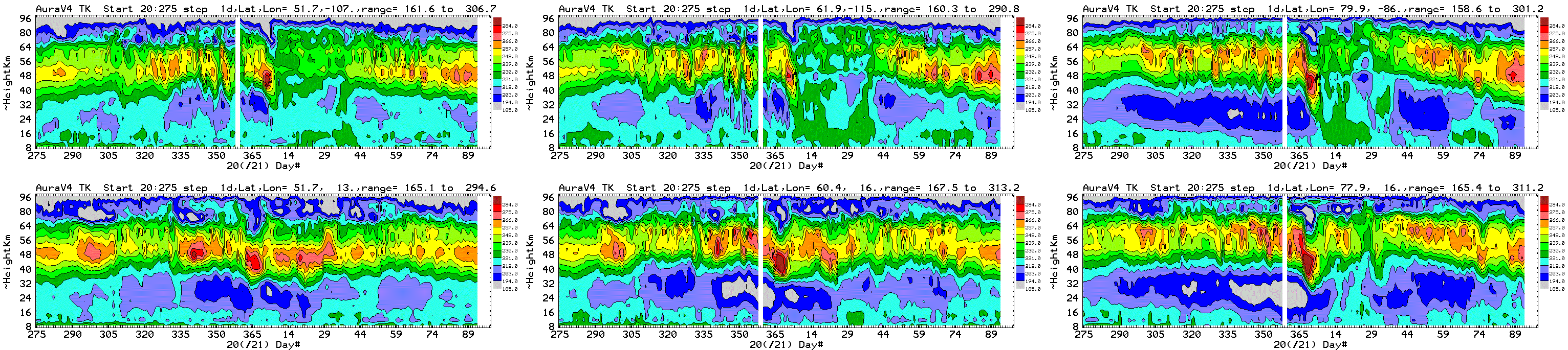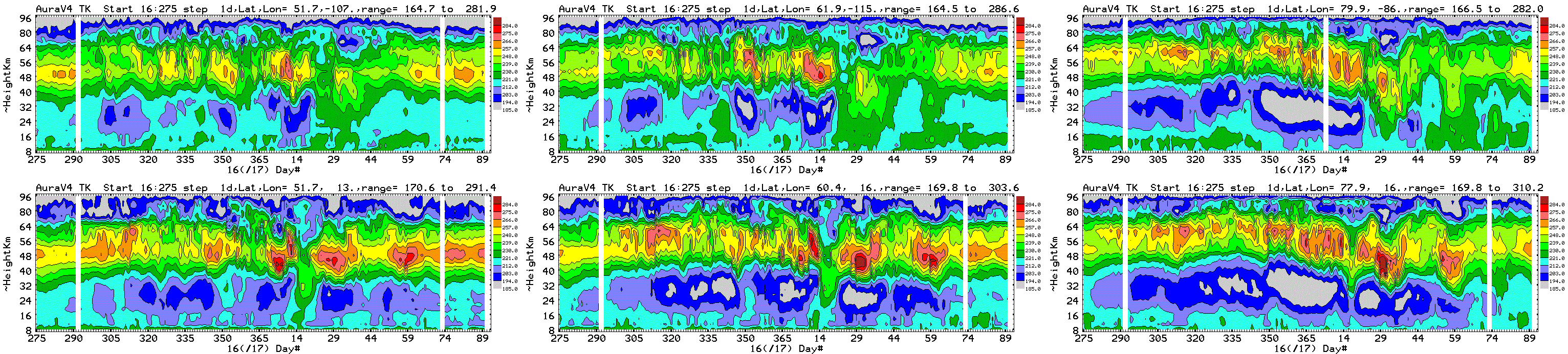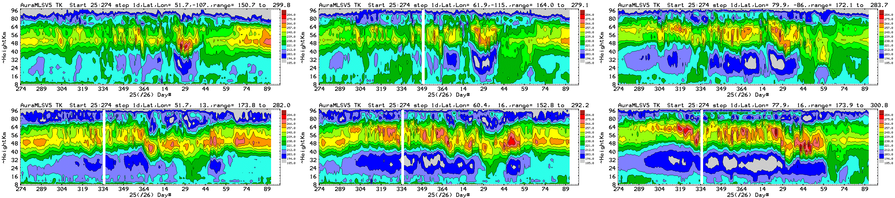 Six chosen Northern hemisphere locations: daily average Aura MLS