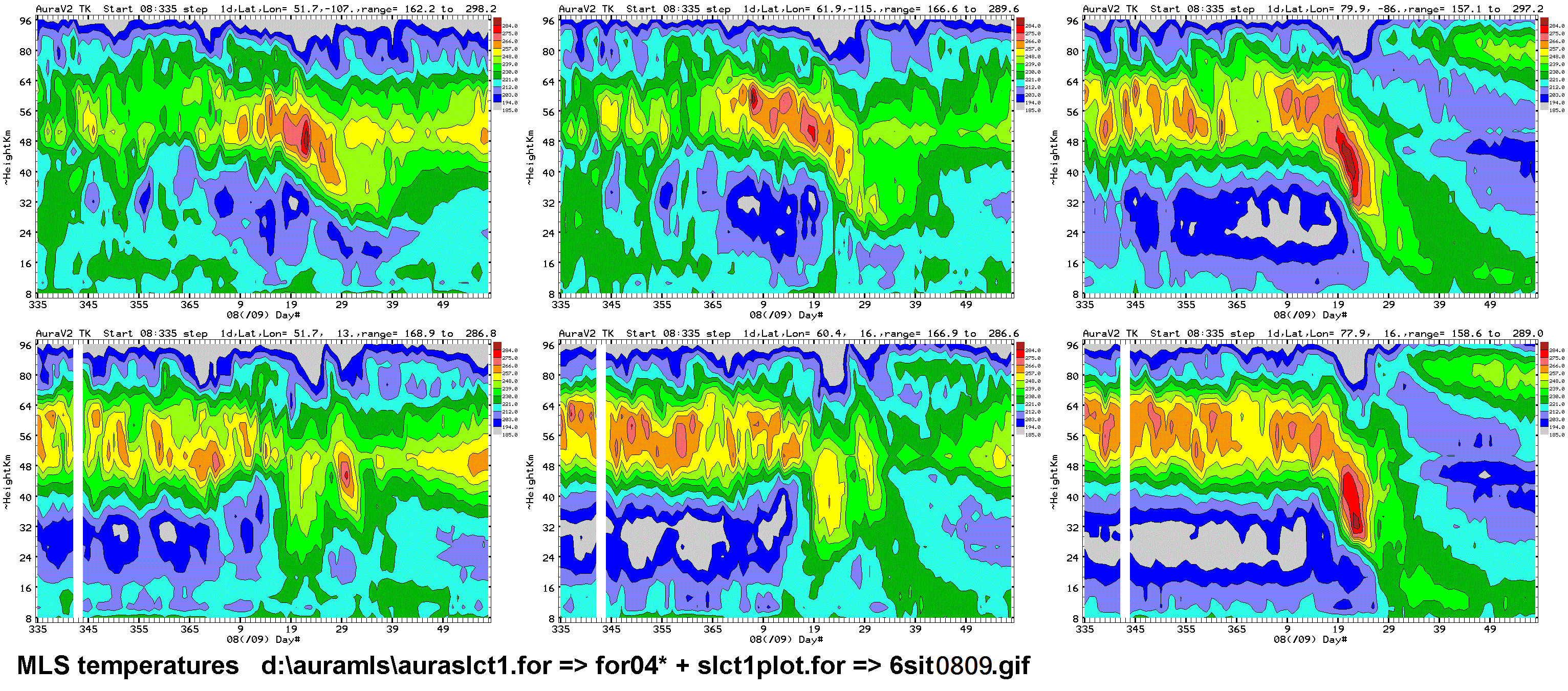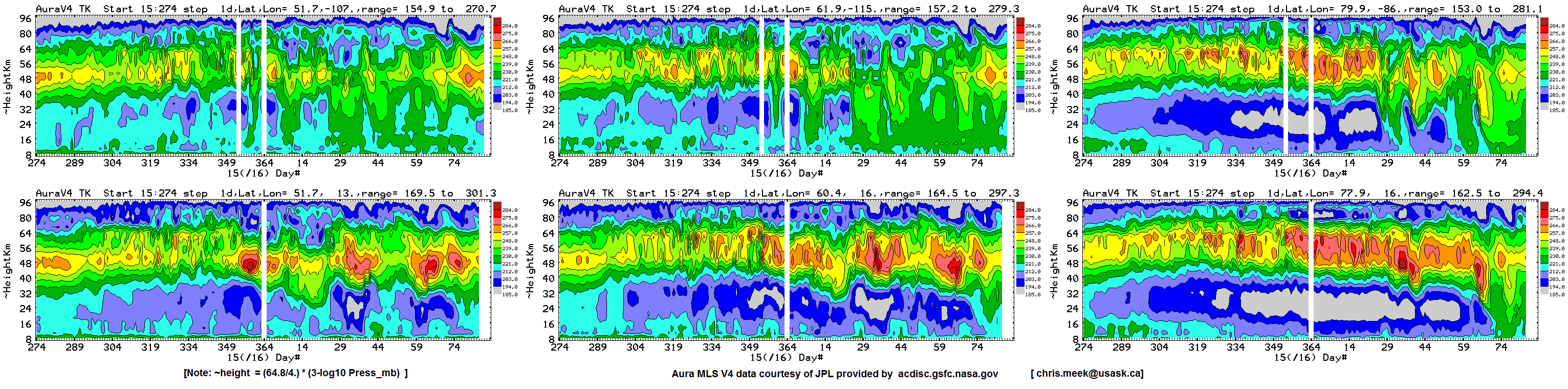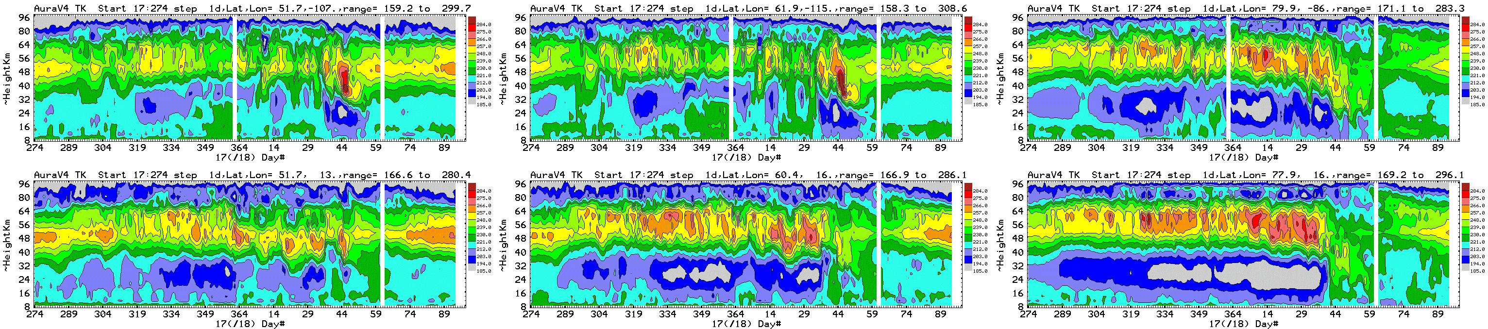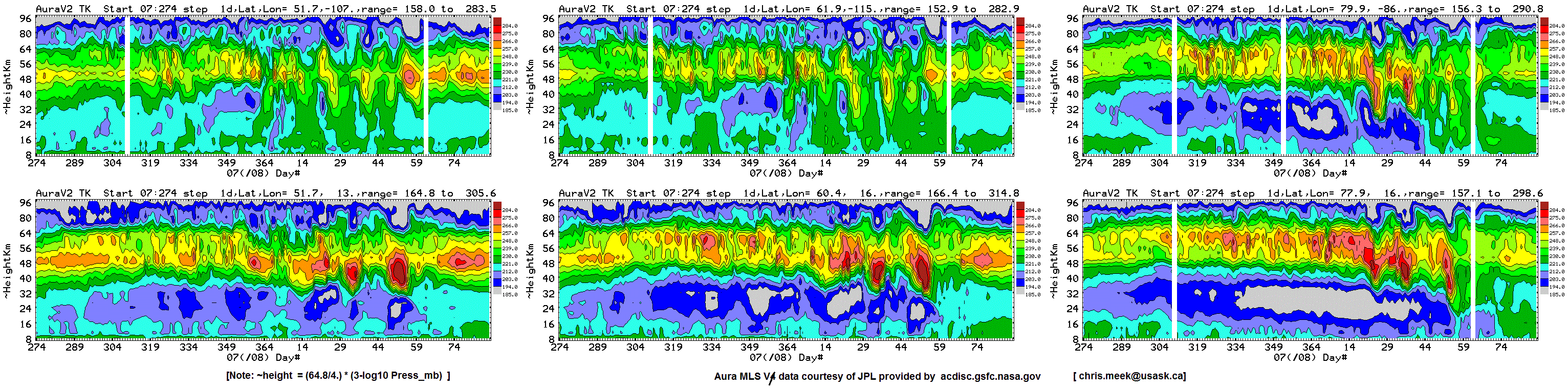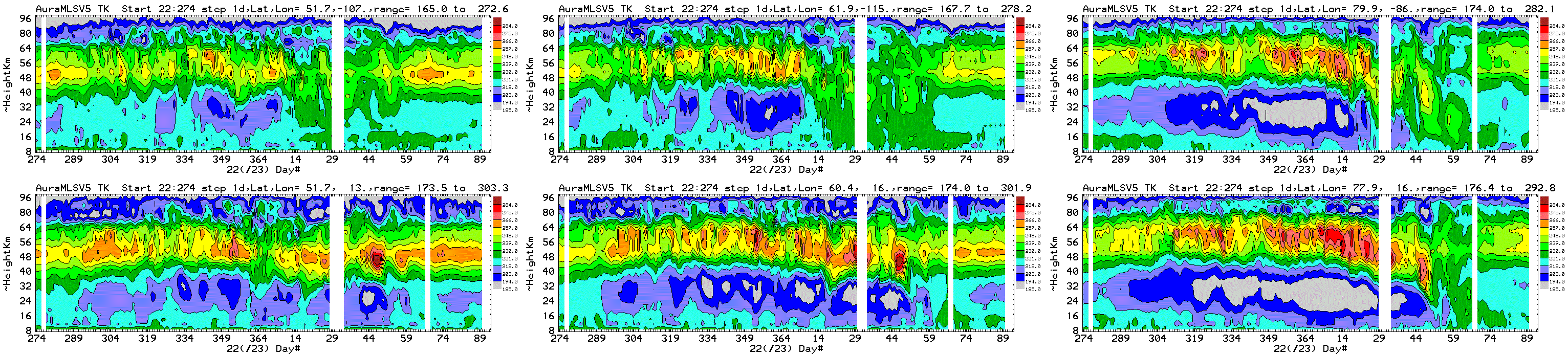 Six chosen Northern hemisphere locations: daily average Aura MLS