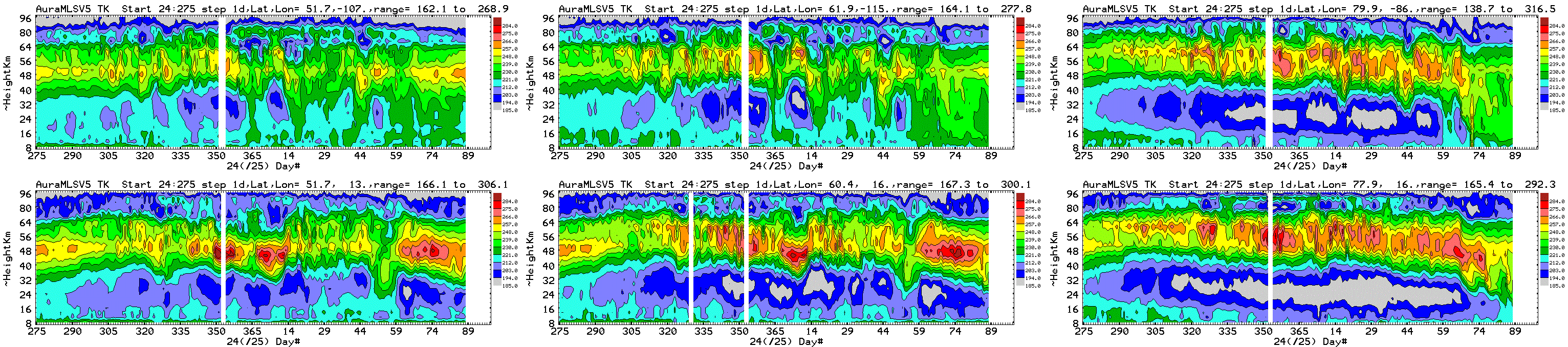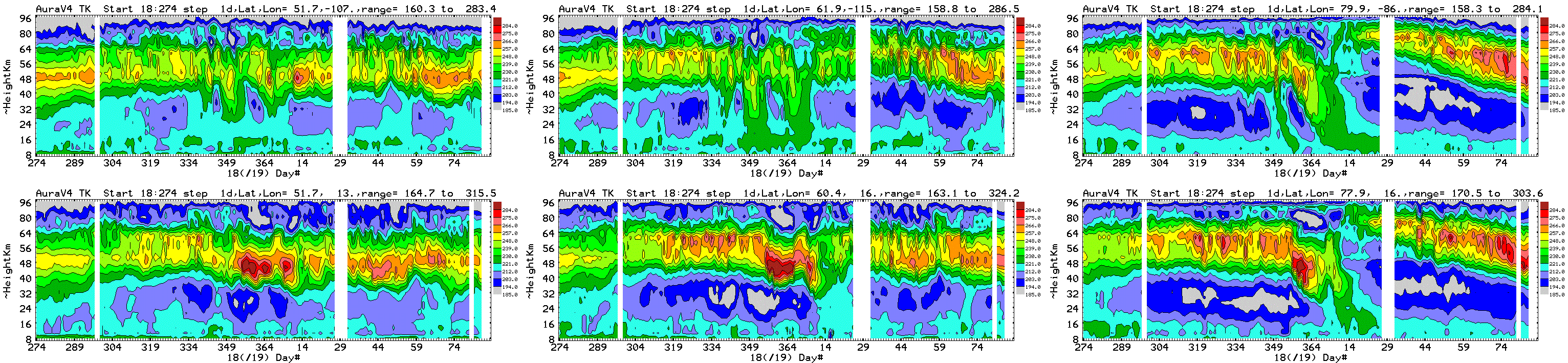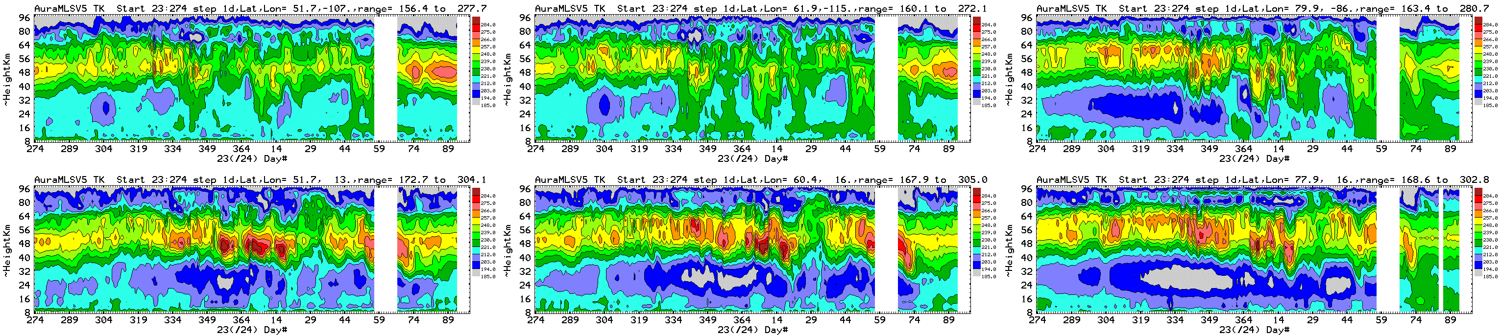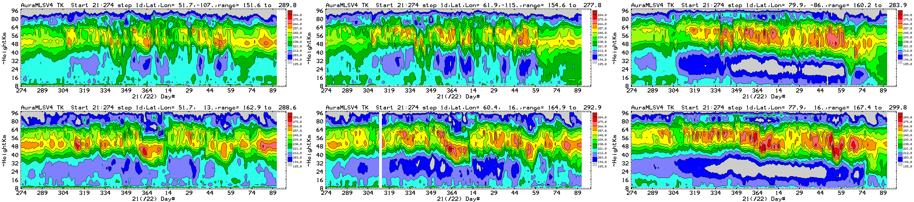 Six chosen Northern hemisphere locations: daily average Aura MLS