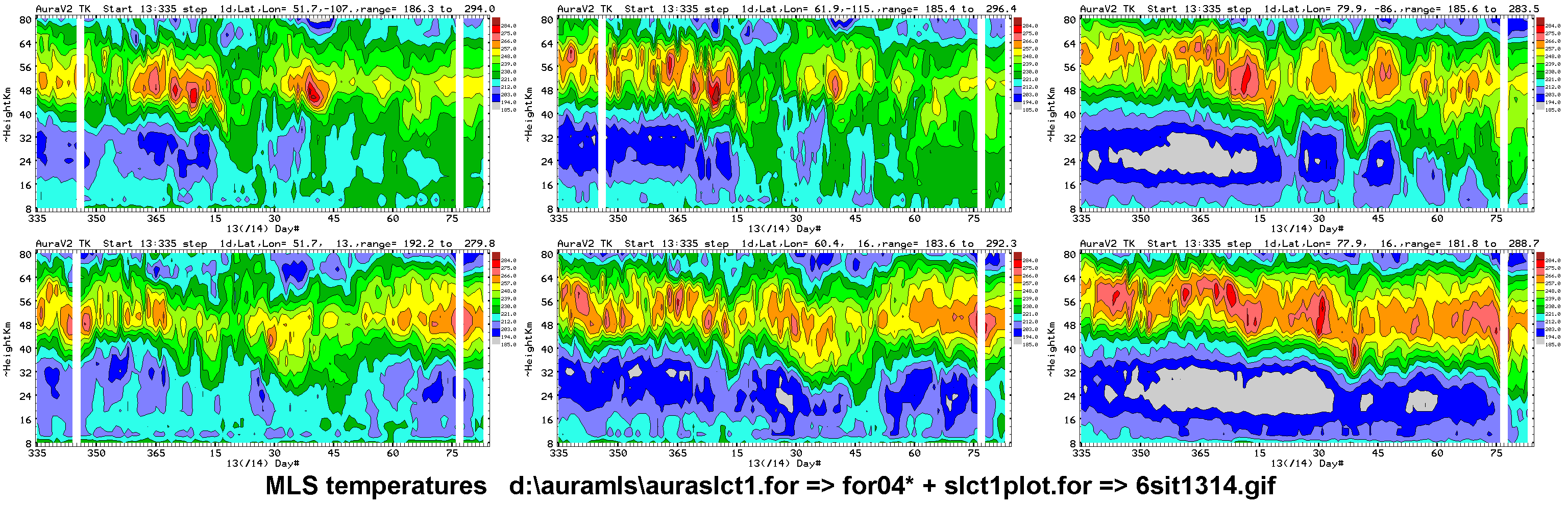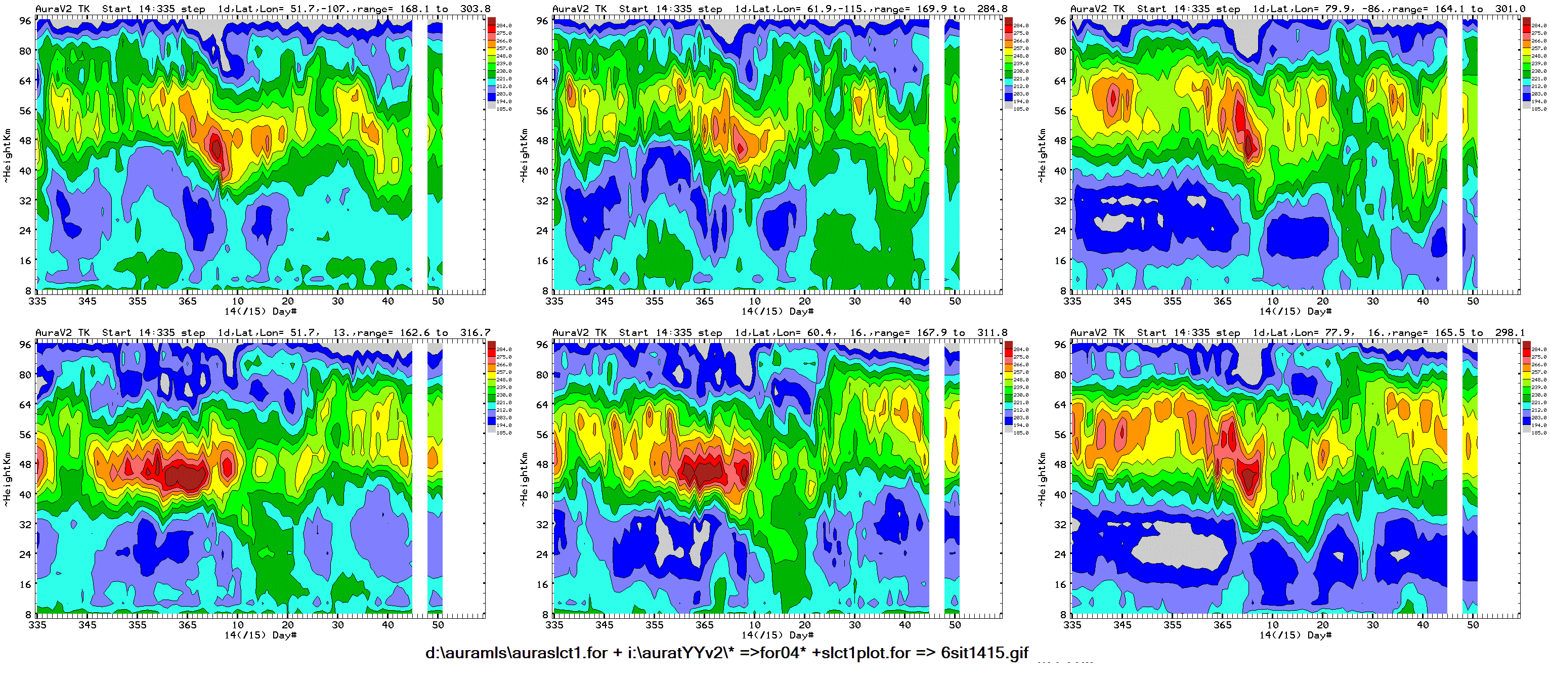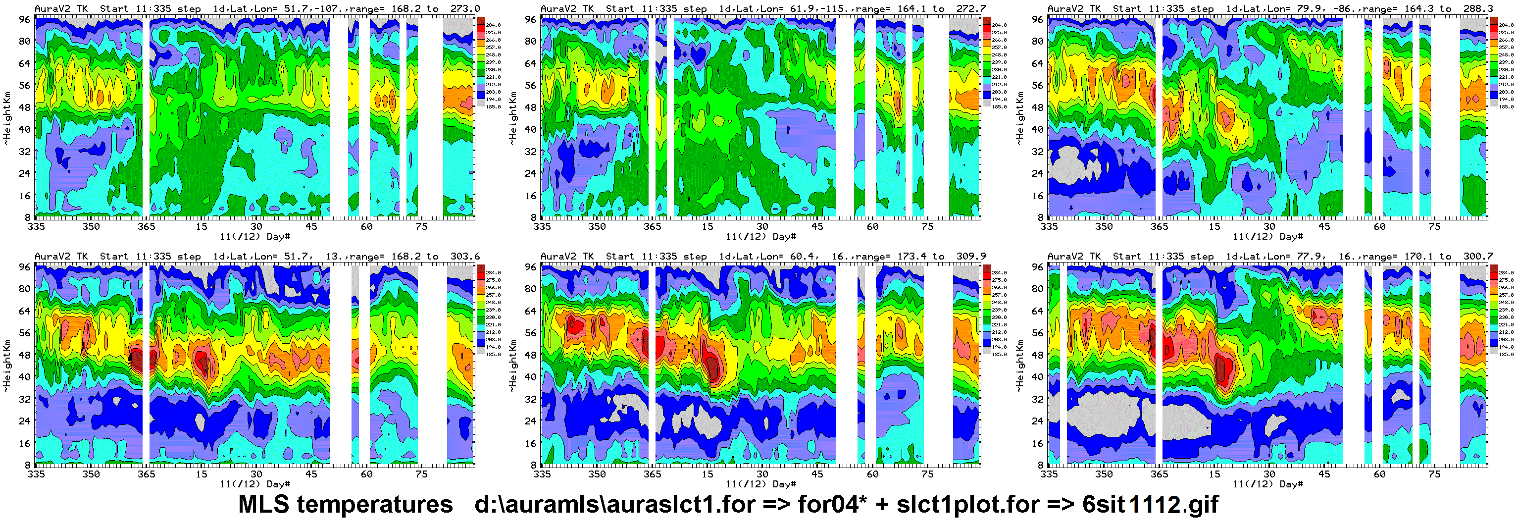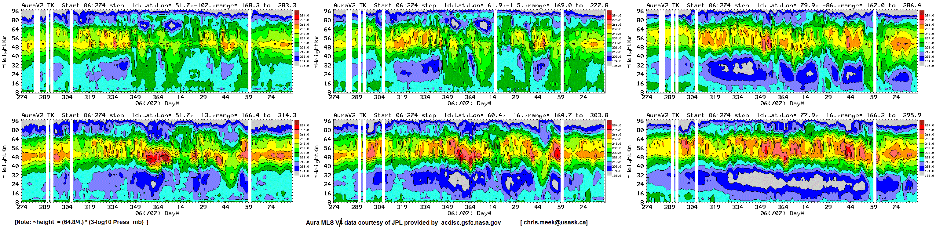 Six chosen Northern hemisphere locations: daily average Aura MLS